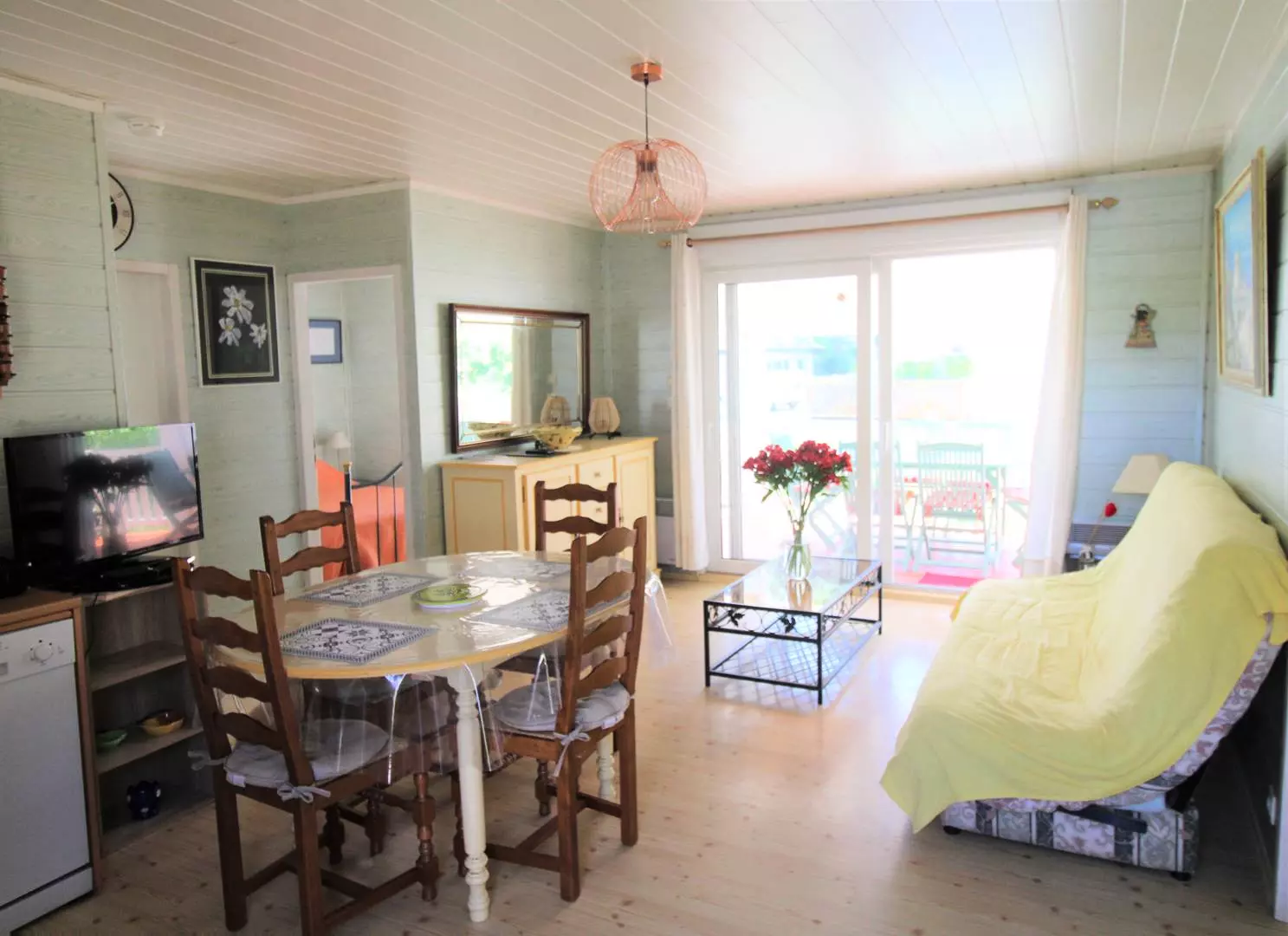 Après quelques marches, l'entrée du chalet, d'environ 60 m2, s'ouvre sur la pièce de vie qui donne sur sa grande terrasse.